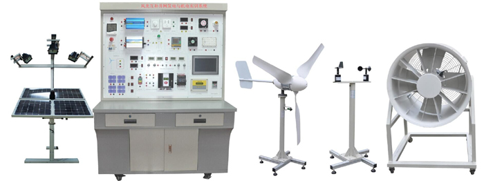 系統(tǒng)裝置由太陽能光伏電板、雙軸跟蹤控制模塊、蓄電池模塊、太陽能控制器模塊、太陽能逆變器模塊、模擬風(fēng)洞發(fā)電模塊、開關(guān)控制模塊、環(huán)境監(jiān)測模塊、上位機監(jiān)控模塊,儀表顯示部分,(各功能轉(zhuǎn)換接口模塊)等組成;各控制系統(tǒng)集成于風(fēng)能發(fā)電、光伏發(fā)電為一體的教學(xué)實訓(xùn)臺;各系統(tǒng)通過連接電纜進行連接,形成一套可完成風(fēng)力及光伏發(fā)電、同步并網(wǎng)、離網(wǎng)電源的實驗及教學(xué)演示。幫助學(xué)生理解太陽能并網(wǎng)、離網(wǎng)及風(fēng)力發(fā)電系統(tǒng)的原理,從而起到學(xué)習(xí)工程實際應(yīng)用技能的作用。