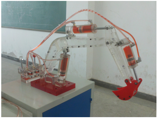 實訓臺主要由底柜,透明大臂,透明斗桿,透明挖斗(紅色),透明油缸,透明集成閥島,透明手動換向閥,透明電磁閥,旋缸馬達,減速器等成