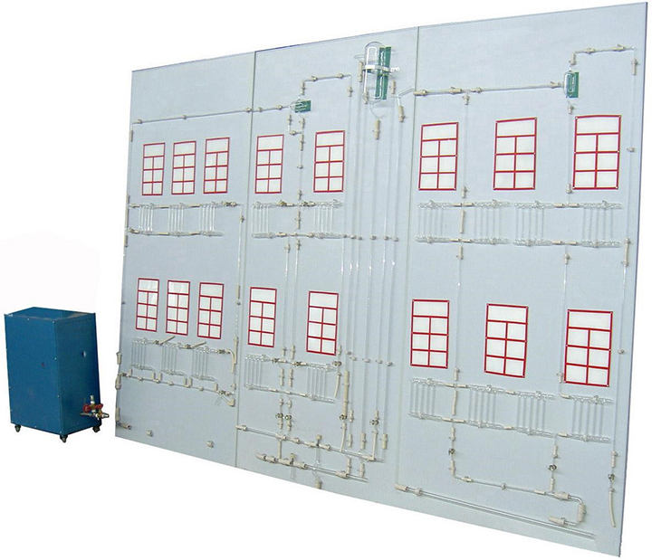 模擬采暖散熱器片、采暖供水干支管道、回水干支管道、集氣罐、高位膨脹水箱、溢水管、信號管、循環(huán)管、排水管、膨脹管、模擬房間墻面、模擬供暖鍋爐、供水泵、供水箱、實驗臺框架等。