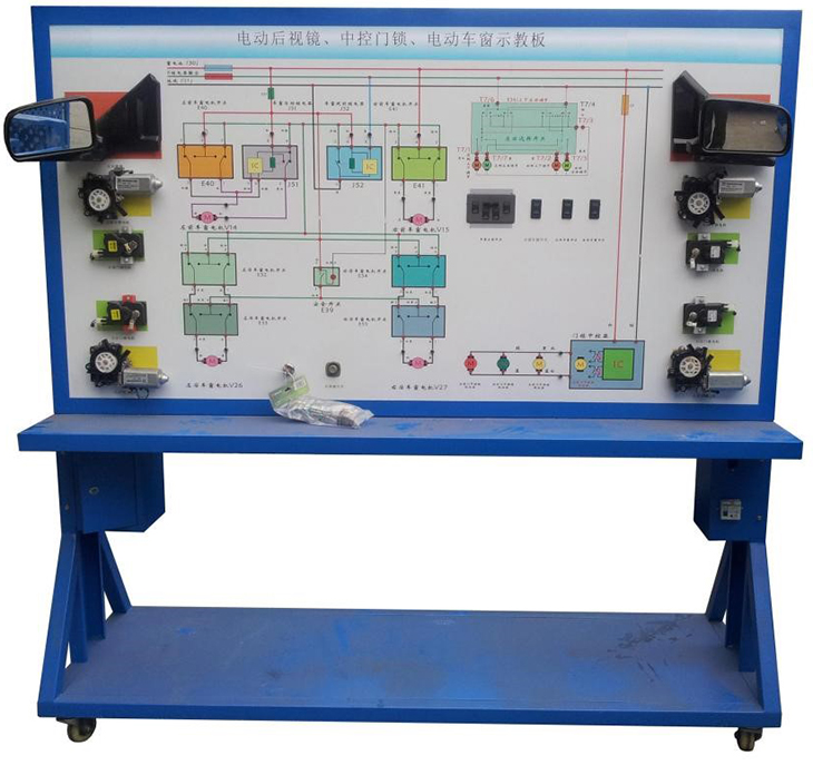 3.示教板面板采用4mm厚耐腐蝕、耐創(chuàng)擊、耐污染、防火、防潮的高級鋁塑板,表面經特殊工藝噴涂底漆處理;面板打印有永不褪色的彩色電路圖;學員可直觀對照電路圖和實物,認識和分析汽車電動窗、中控門鎖系統(tǒng)的工作原理。