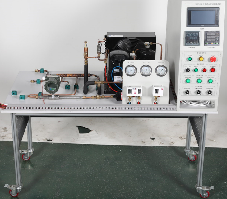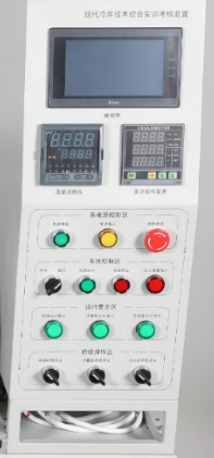 3、開放性。該設(shè)備設(shè)置了一個(gè)系統(tǒng)操作臺,在庫體一側(cè)安裝有可更換側(cè)板,以便于學(xué)員在上述的操作臺與側(cè)板上安裝制冷系統(tǒng)和電路系統(tǒng)等。