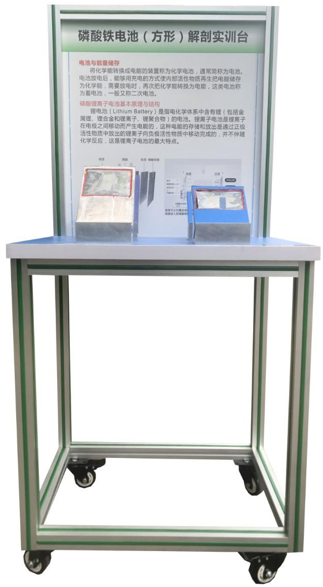 3.實(shí)訓(xùn)臺(tái)由可移動(dòng)臺(tái)架與原理面板組成,面板立放,繪制三維立體解剖結(jié)構(gòu)圖,介紹單體電池基本知識(shí),展示磷酸鐵鋰動(dòng)力電池基本參數(shù)。