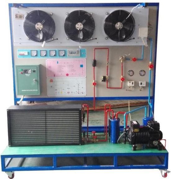 工業(yè)制冷系統(tǒng)實(shí)訓(xùn)考核裝置主要由半封閉式制冷壓縮機(jī)、冷凝器、蒸發(fā)器、膨脹閥和故障設(shè)置開關(guān)、測試儀表等組成。實(shí)訓(xùn)臺通過手閥開關(guān)和鈕子開關(guān)分別來設(shè)置管路系統(tǒng)和電控系統(tǒng)的 20 多種故障。設(shè)備采用先進(jìn)的電控系統(tǒng)并具有具有開相,缺相, 過流等保護(hù)功能。蒸發(fā)器風(fēng)扇采用變頻器控制速度。配備 8 路溫度計(jì),電壓表,電流表,功率表,功率因數(shù)表和壓力表,能實(shí)時觀察運(yùn)行參數(shù)
