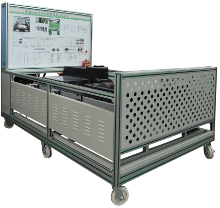 (比亞迪e5 EV300純電動(dòng)汽車) 鋰動(dòng)力電池組、電池管理系統(tǒng)BMS、BMS顯示屏(7寸觸摸屏)、維修開關(guān)、輔助蓄電池(12V45AH)、高壓配電箱、漏電傳感器、車載充電機(jī)、國(guó)標(biāo)充電插座與充電槍、直流接觸器(包含充電繼電器、總正繼電器、總負(fù)繼電器、預(yù)充繼電器)、急停開關(guān)與電源總開關(guān)、一體化全鋁合金型材搭建的移動(dòng)臺(tái)架(1500×700×1700mm ,帶自鎖腳輪裝置,帶安裝檢測(cè)端子的原理面板1448×940mm)、故障考核系統(tǒng)、設(shè)備操作說明書。