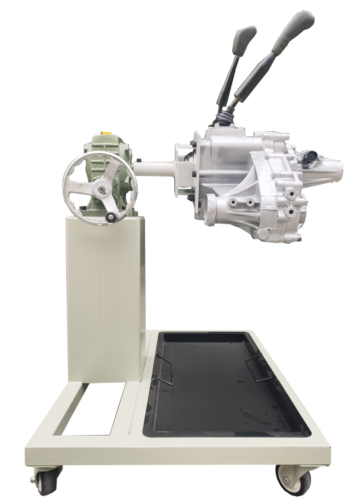 采用減速翻轉(zhuǎn)機(jī)構(gòu),可使變速器旋轉(zhuǎn)任意角度,并能任意位置鎖止,便于學(xué)生從不同的角度進(jìn)行拆卸和裝配。
