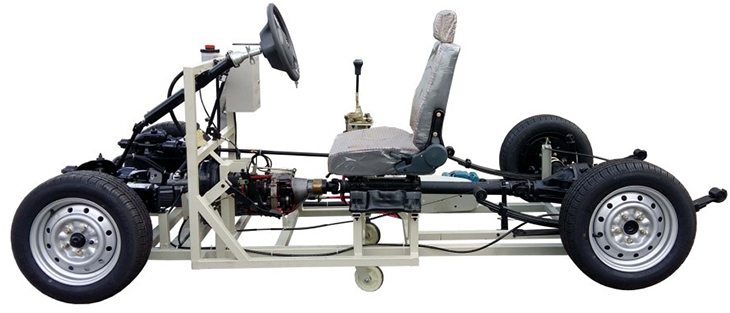 包括前后懸掛系、轉(zhuǎn)向系、傳動(dòng)系、手動(dòng)變速器及掛檔機(jī)構(gòu)、制動(dòng)系等系統(tǒng)、安裝腳輪的可移動(dòng)式臺(tái)架等組成。