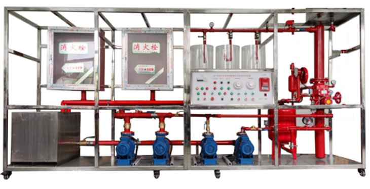模型框架和水箱等主要部件全部使用不銹鋼器件,保證不生銹、不易老化,模擬大樓噴淋滅火系統(tǒng);模型系統(tǒng)主要由噴淋水泵、氣壓罐、濕式報(bào)警閥、水力警鈴、延時(shí)器、壓力開關(guān)、水流指示器、封閉式噴頭、試驗(yàn)閥、火災(zāi)探測器、火災(zāi)報(bào)警器等典型噴水滅火設(shè)備構(gòu)成,能生動(dòng)模擬大樓內(nèi)水滅火系統(tǒng)的典型結(jié)構(gòu)。