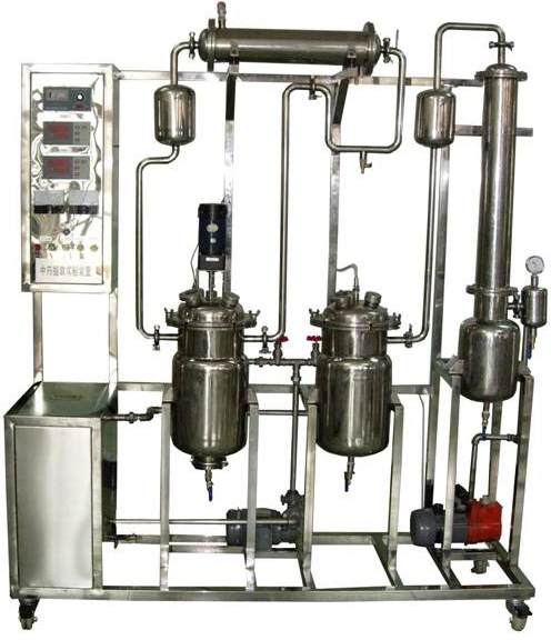 中藥提取實驗裝置由提取罐、蒸發(fā)器、攪拌電機、列管式加熱器、冷凝器、油分器、收油器、藥液泵、貯液罐、過濾器、真空泵、調(diào)速器、數(shù)顯溫度儀、不銹鋼框架、控制屏等組成。提取罐、蒸發(fā)器配導熱油加熱系統(tǒng),提取罐、蒸發(fā)器頂部蒸汽出口均設(shè)置了除沫器。