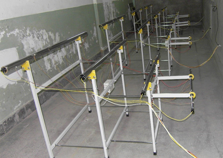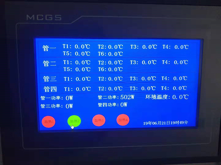 配有四根不同長(zhǎng)度和直徑的電鍍紫銅管,管內(nèi)設(shè)置電加熱器;每根管子的表面裝46支測(cè)溫傳感器,以測(cè)定其表面平均溫度,測(cè)溫傳感器采用進(jìn)口DS18B20;每根橫管電加熱器配備電子集成固體調(diào)壓模塊無(wú)機(jī)調(diào)節(jié)。測(cè)試儀表箱設(shè)有(每根橫管電加熱器)數(shù)顯功率表;所有測(cè)試數(shù)據(jù)由7寸觸摸屏同屏顯示,不銹鋼實(shí)驗(yàn)支架。