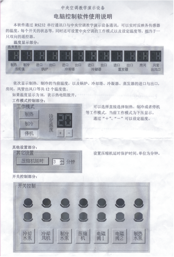 為了更好地滿足各大院校的教學需要,在原來開發(fā)的中央空調(diào)實驗設(shè)備的基礎(chǔ)上,配備了RS-232串行通訊接口,可直接與電腦連接,由電腦控制軟件控制整個實驗臺的運行,包括:總控臺啟動、制冷、制熱、冷卻水泵、冷卻風機、制冷水泵、壓縮機、電磁閥、制熱水泵做演示,制冷、制熱的溫度設(shè)定等。