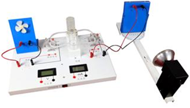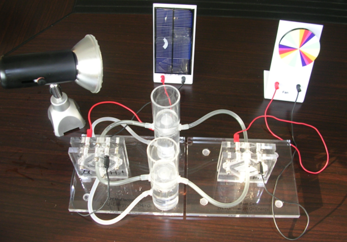 燃料電池教具是利用光線照射在太陽能電池板上產(chǎn)生電能,然后利用產(chǎn)生的電能作用在電解電池模塊上,使水發(fā)生電解產(chǎn)生氫氣和氧氣。氫氣和氧氣進入到發(fā)電模塊產(chǎn)生電能,帶動風扇轉動。